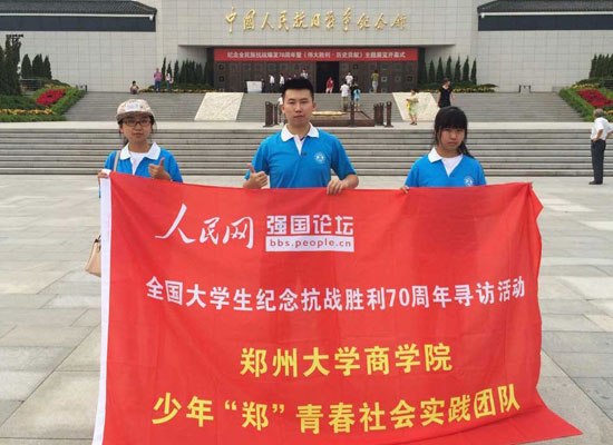 7月16日,鄭州大學(xué)“少年鄭青春”暑期實踐隊,開展了“緬懷革命先烈,樹立信心實現(xiàn)中國夢”實踐活動。團隊通過抗戰(zhàn)知識調(diào)研、參觀抗戰(zhàn)紀(jì)念館、采訪抗戰(zhàn)老兵、向幼兒園孩子普及抗戰(zhàn)知識等方式紀(jì)念抗戰(zhàn)勝利70周年。